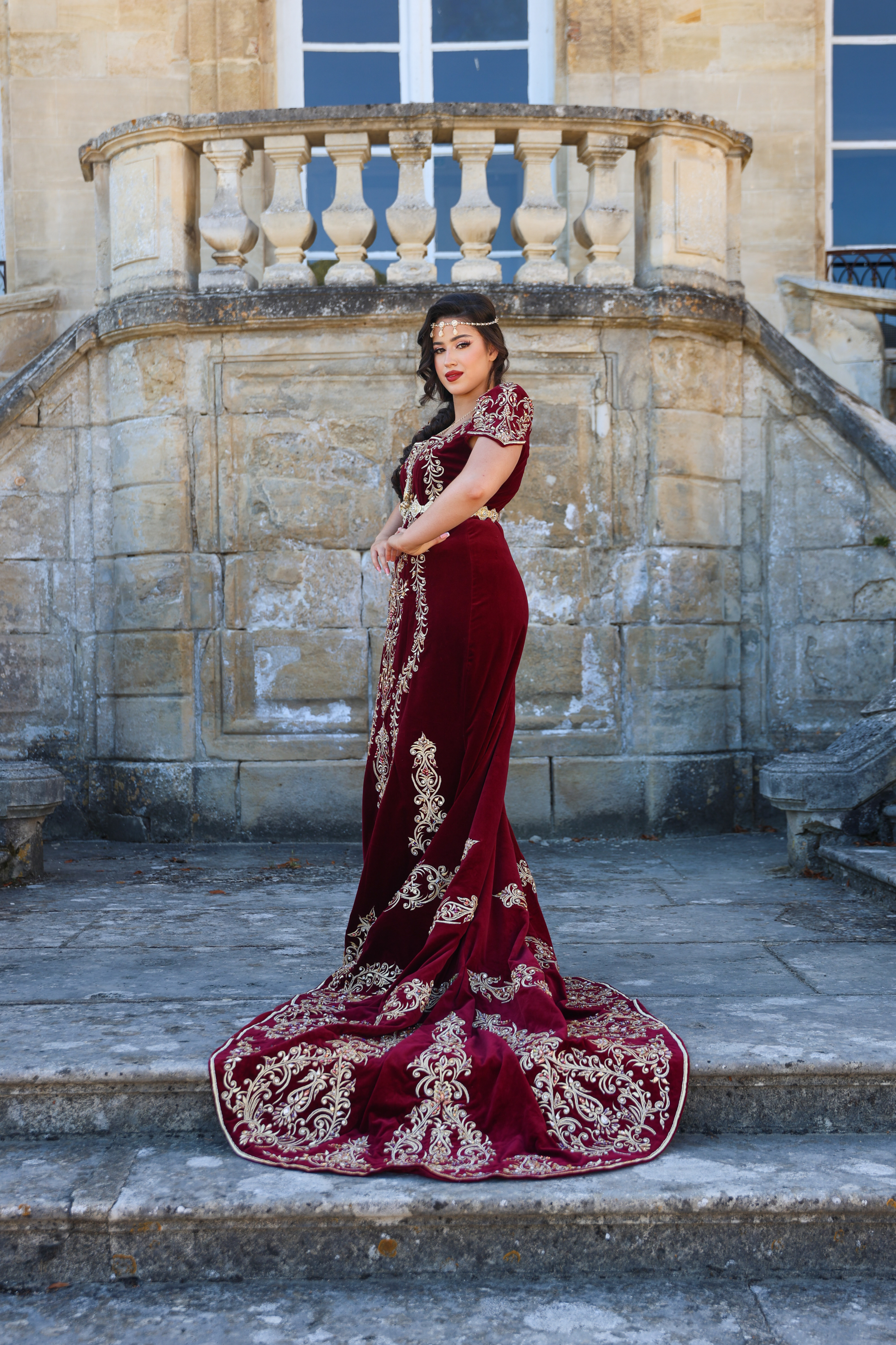 Notre Fergani traditionnel revisité apporte une touche moderne à ce classique intemporel. Confectionné en velours bordeaux, il est orné de broderies en fil d’or, créant un contraste élégant. Sa longue traîne majestueuse ajoute une touche royale à l’ensemble. Ce modèle reste fidèle à l’héritage du Fergani tout en étant pensé pour la mariée moderne, alliant tradition et élégance.